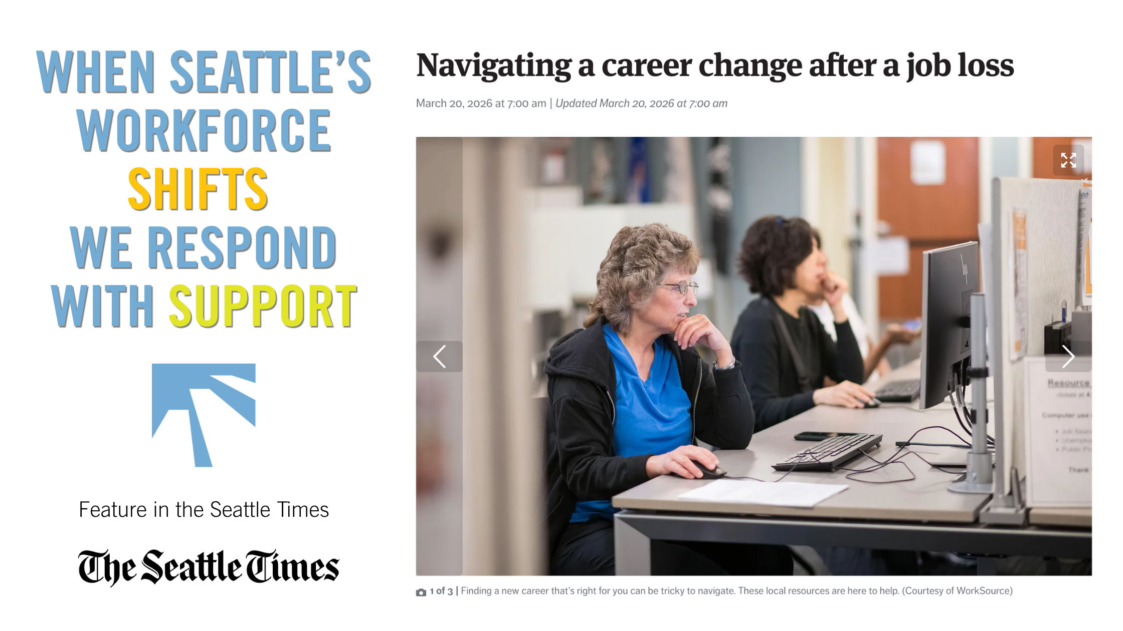 We appreciate Al Kemp and The Seattle Times for examining the realities workers are facing — and the systems of support that can help. Read the full article here to hear more from Kristan, Harpreet, and others on navigating Seattle’s evolving job market.